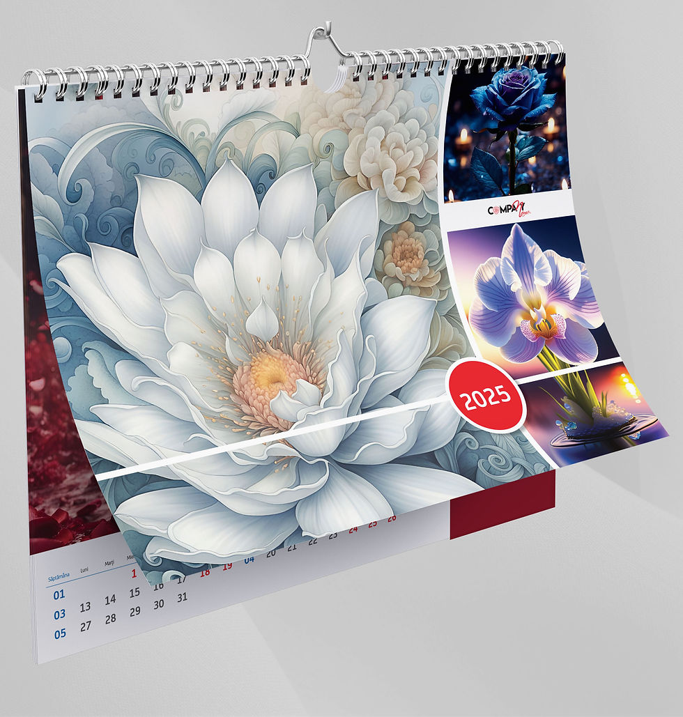 Pe fiecare pagina vom imprima logo-ul si mesjele tale. In plus, îti poti personaliza calendarul cu imaginile pe care le doresti. E suficient sa ne trimiti cele 13 fotografii.
